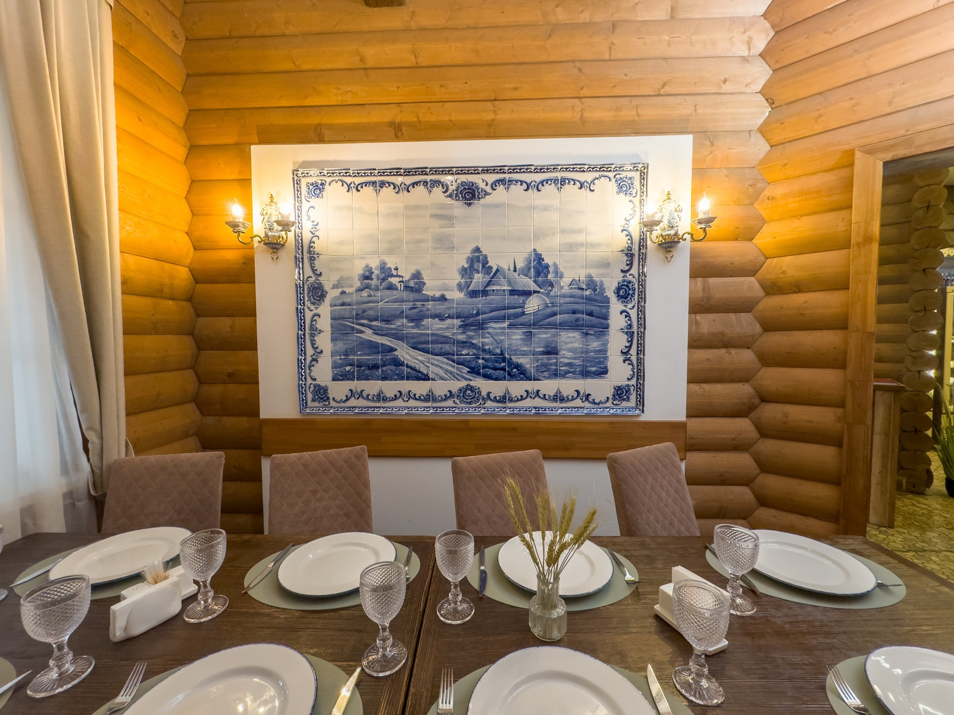Уютный банкетный зал, оформленный в русском стиле «Гжель», вместимостью...